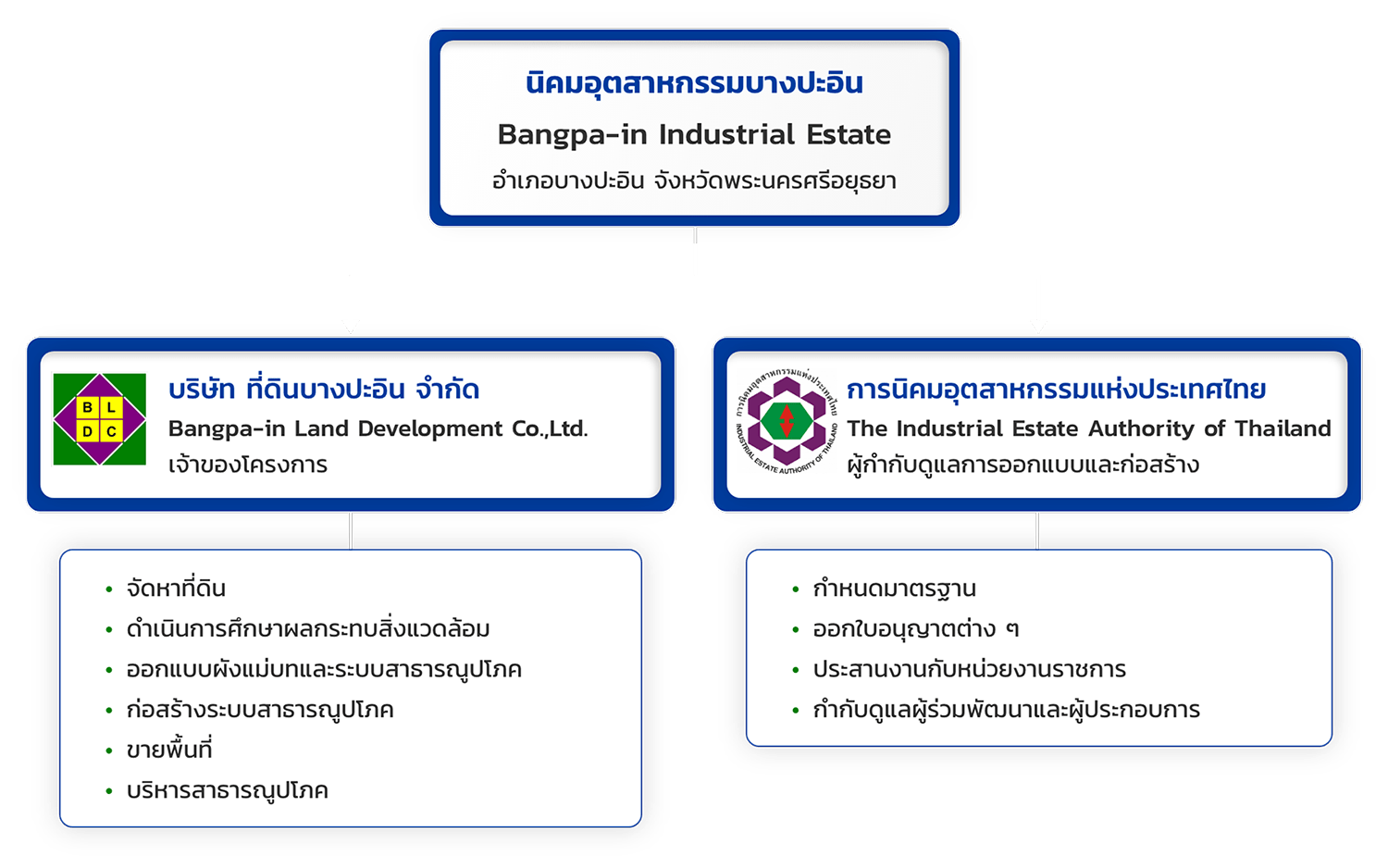 การนิคมอุตสาหกรรมแห่งประเทศไทย (กนอ.) เป็นรัฐวิสาหกิจสังกัดกระทรวงอุตสาหกรรม ตามพระราชบัญญัติการนิคมอุตสาหกรรมแห่งประเทศไทย พ.ศ. 2522 มีหน้าที่รับผิดชอบในการพัฒนาและจัดตั้งนิคมอุตสาหกรรม โดยจัดพื้นที่สำหรับโรงงานอุตสาหกรรมให้เข้าไปอยู่รวมกันอย่างมีระบบและมีระเบียบ อีกทั้งยังเป็นกลไกของรัฐบาลในการกระจายการพัฒนาภาคอุตสาหกรรมออกสู่ภูมิภาคทั่วประเทศ แบ่งเป็น นิคมอุตสาหกรรม ที่กนอ.ดำเนินการเอง และนิคมอุตสาหกรรมร่วมดำเนินงาน บริษัท ที่ดินบางปะอิน จำกัด ทำสัญญาร่วมดำเนินการโครงการนิคมอุตสาหกรรมบางปะอิน กับ การนิคมอุตสาหกรรมแห่งประเทศไทย (กนอ.) ลงวันที่ 22 ธันวาคม 2532 การนิคมอุตสาหกรรมแห่งประเทศไทย (กนอ.) และ บริษัท ที่ดินบางปะอิน จำกัด มีบทบาทหน้าที่ดังนี้