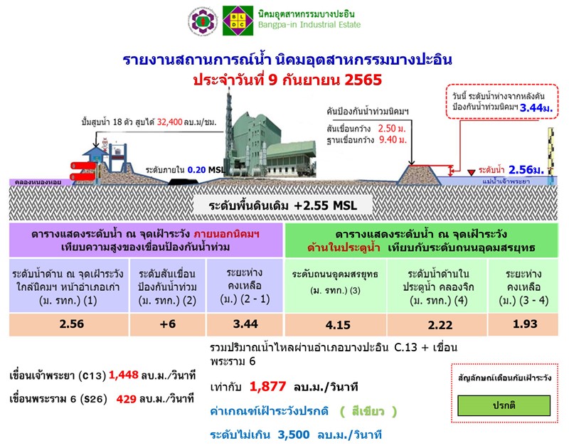 รายงานสถานการณ์น้ำ นิคมอุตสาหกรรมนิคมบางปะอิน ประจำวันที่ 9 กันยายน 2565 (เช้า)